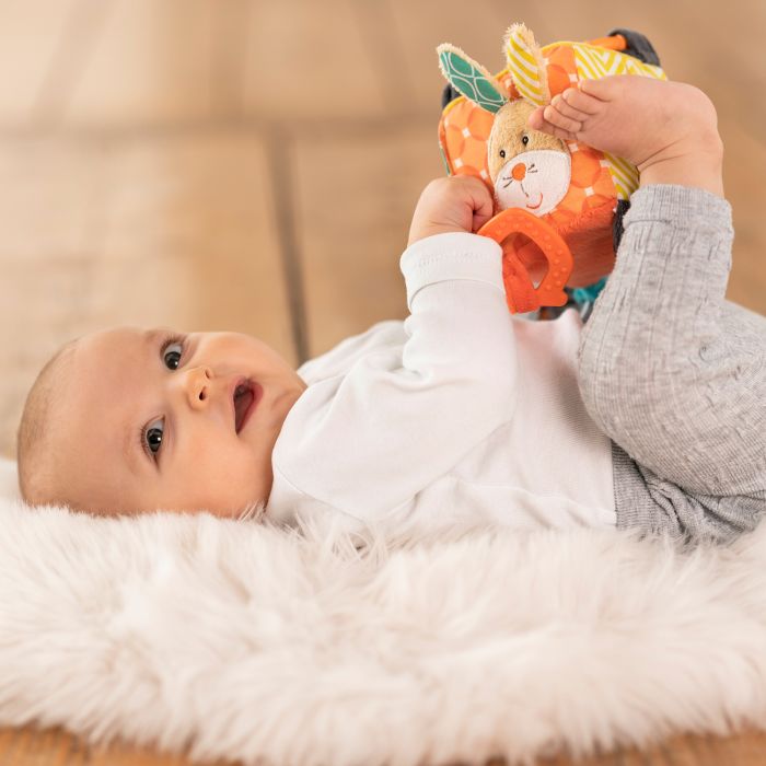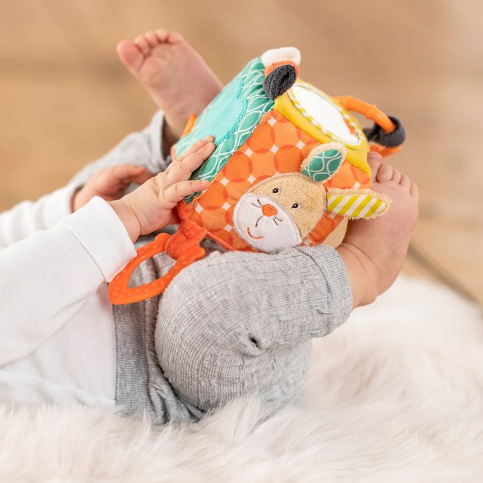 ntroducing our captivating Educational Activity Cube, designed to capture your baby’s heart and stimulate their curiosity! This interactive toy introduces your little one to a delightful world of animals, vibrant colors, and engaging pendants for endless exploration. Whether at home or on the go, this activity cube provides playtime excitement thanks to its practical C-ring, allowing for easy attachment to your pram, stroller, car seat, or cot. The cube is filled with a kaleidoscope of colors and features that will keep your baby engaged and entertained. Within the cube, your baby will discover a teether for soothing their gums, a mirror to encourage self-discovery, and an array of playful sounds produced by the rattle ring, crinkly paper, and hidden dingdong. These interactive elements encourage sensory development and provide endless amusement. The cube’s clever design incorporates various grasping features, ensuring that your baby’s developing motor skills are stimulated while providing endless tactile exploration. It’s the perfect toy to keep your little one entertained and engaged wherever they go. This Educational Activity Cube also makes an ideal gift for any occasion, offering a world of educational play and sensory exploration. Give your baby the gift of joyful learning and watch their imagination blossom.