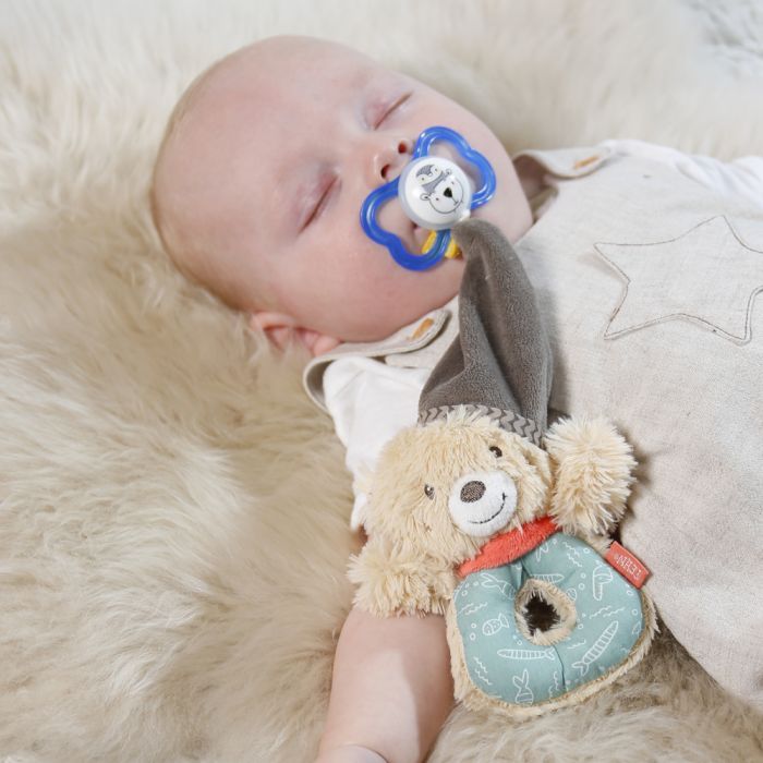 The little ring grabber bear playfully stimulates baby´s sense of hearing, touch and grasping. With the great corduroy material and exciting sound of the integrated rattle, it never gets boring. Babies love the cute fabric bear to grasp, touch, discover & cuddle! The little bear can be taken everywhere and can accompany your baby while playing and dreaming in the cot, in the baby car seat or in the stroller.